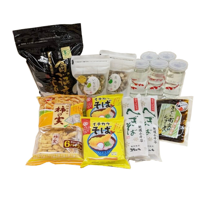 | 内容 | ・魚沼わたなべ農園のJAS有機栽培米(2kg)×1袋 ・長者カップ(200ml)×5本、長寿豆(120g)×1袋 ・いなか豆(100g)×1袋 ・柿の実(25g×6袋)・イチカラそば(103g)×2袋 ・越後小千谷へぎそば(乾麺・200g)×2袋 ・かぐら南蛮のんま煮(100g)×1袋 |