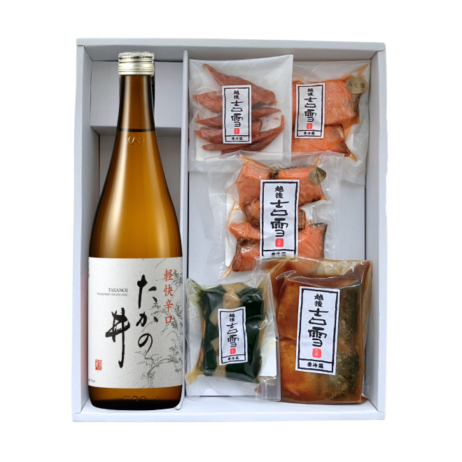 小千谷にて進物でトップクラスの人気を誇る「吉雪(きっせつ)」特製の鮭各種と地元蔵元の高の井酒造のキレとコクのある本格辛口酒の詰め合わせです。