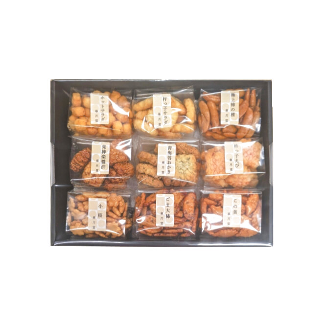| 内容量 | 米菓9種類 ・極上柿の種(40g)・ホットサラダ(40g)・青海苔おかき(30g)・ごま大柿(40g)・この葉(40g)・杵っ子サラダ(30g)・小桜(40g)・鬼神楽醤油味(35g)・杵っ子えび(30g) |