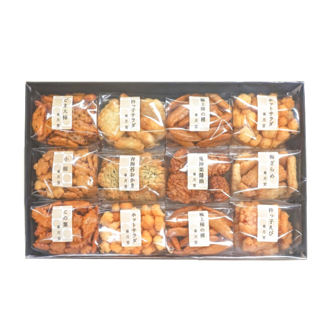 | 内容量 | 米菓10種類 ・極上柿の種(40g)×2袋・ホットサラダ(40g)×2袋・青海苔おかき(30g)・ごま大柿(40g)・この葉(40g)・杵っ子サラダ(30g)・小桜(40g)・鬼神楽醤油味(35g)・杵っ子えび(30g)・梅ざらめ(25g) |